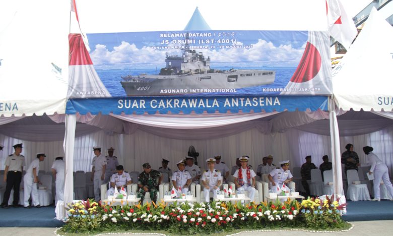 Komandan Komando Daerah Angkatan Laut (Kodaeral) III Laksamana Muda TNI Uki Prasetia, S.T., M.M. yang diwakili Asisten Operasi (Asops) Kodaeral III Kolonel Laut (P) Yovan Ardhianto Yusuf, S.E., M.Tr.Opsla. menyambut kedatangan kapal perang Jepang JS OSUMI (LST-4001) di Dermaga 107, Tanjung Priok, Jakarta Utara. Sabtu (23/8).