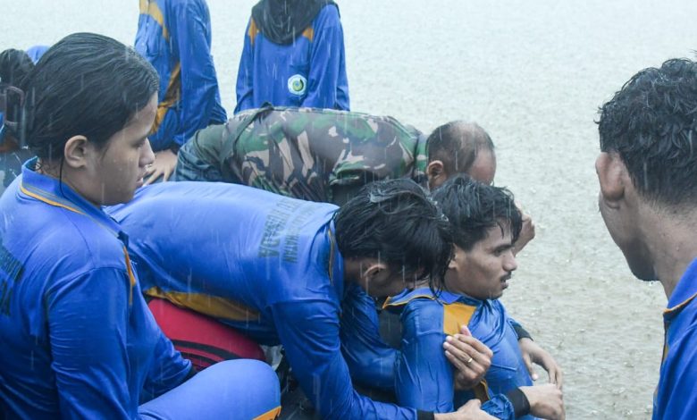Kegiatan yang dilaksanakan ditengah guyuran hujan yang melanda tersebut tidak menyurutkan semangat dan antusiasme mahasiswa dalam menyimak instruksi dan mengikuti semua tahap pelatihan yang dijelaskan oleh Tim Evakuasi Medis Laut.