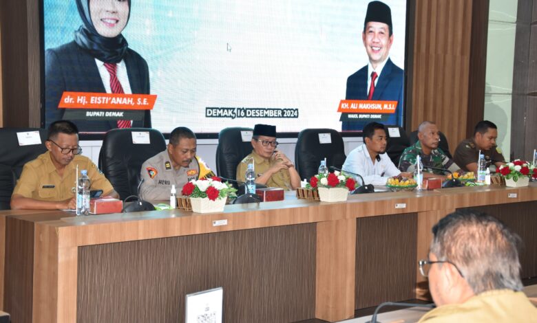Rapat yang dipimpin Wakil Bupati Demak, KH. Ali Makhsun, M.Si, didampingi Sekda Kab. Demak, Ahmad Sugiarto ST, MT, guna membahas persiapan menyambut Hari Raya Natal 2024 dan Tahun Baru 2025.