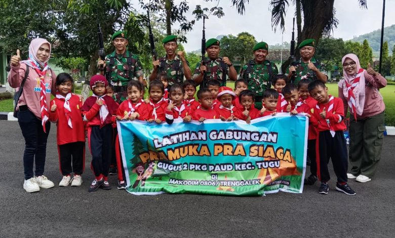 TRENGGALEK || Koranprogresif.id – Sinar matahari pagi baru menanjak di ufuk timur ketika halaman Makodim 0806/Trenggalek mulai dipenuhi sorak tawa puluhan anak usia dini. Dengan rompi dan topi khas Pramuka Pra Siaga, para siswa dari Gugus 2 PKG PAUD Kecamatan Tugu datang penuh semangat. Mereka bukan sekadar berwisata edukatif, melainkan benar-benar memasuki “kelas kebangsaan” langsung bersama TNI, Selasa (21/1/2025).