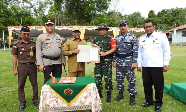 Selanjutnya Bupati Kabupaten Kepulauan Sula, PLH. Setda Kabupaten Kepulauan Sula Bambang Fataruba beserta Dandim 1510/Sula Letkol Inf Efran Tri Hernowo S.I.P melaksanakan penandatanganan naskah program TMMD dan juga penyematan pita kepada pelaksana TMMD dan dilanjutkan kegiatan foto bersama, tari tarian dan pembagian sembako untuk anak stunting. (Pendim 1510/Sula)