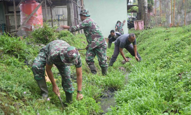 Dengan penuh semangat kebersamaan, para prajurit bahu-membahu membersihkan rumput yang tumbuh liar, menguras selokan agar air mengalir lancar, serta merapikan kebun Makodim hingga tampak lebih tertata.