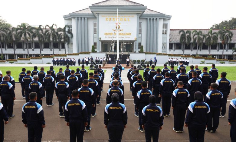 Komandan Sekolah Staf dan Komando Angkatan Laut (Danseskoal) Laksamana Muda TNI Ariantyo Condrowibowo melepas kontingan Seskoal yang akan berlaga di Pekan Olah Raga Angkatan Laut (Poral) Wilayah Barat (Wilbar) dalam sebuah upacara yang berlangsung di lapangan apel Laut Jawa Seskoal, Cipulir, Kebayoran Lama, Jakarta Selatan, Kamis (17/7/2025).