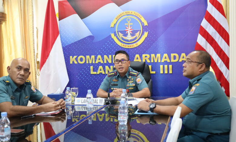 Komandan Lantamal III Laksamana Pertama TNI Uki Prasetia, S.T., M.M. yang diwakili oleh Wakil Komandan (Wadan) Lantamal III Kolonel Laut (P) Ranu Samiaji, S.T., M.M., M.Tr.Opsla. menghadiri Rapat Koordinasi Pembentukan Komponen Cadangan (Komcad) Matra Laut tahun 2025 secara video conference di ruang rapat Mako Lantamal III, Jakarta Utara, Rabu (16/7).