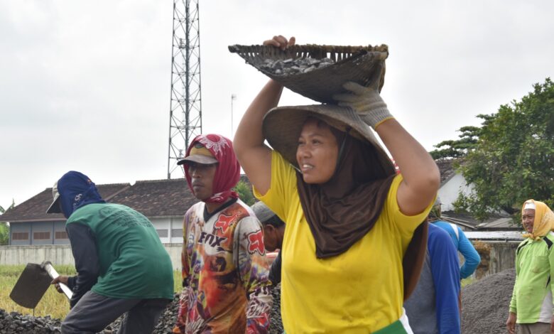 Para ibu-ibu ini mengambil perannya masing-masing, salah satunya ibu Waginem (49), yang akrab dipanggil Lek Nem turut berpanas-panasan di lokasi sasaran fisik pengecoran jalan.