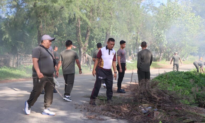 Aceh Barat || Koranprogresif.id, Dalam rangka menyambut perhelatan Pekan Olahraga Nasional (PON) XXI Aceh – Sumut, TNI – Polri bersama Pemda Aceh Barat melaksanakan Gotong Royong mempersiapkan sarana dan prasarana dengan membersihkan areal Lapangan hingga objek kawasan wisata, Sabtu (31/8/2024)