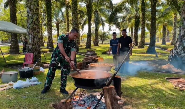 Kegiatan berlangsung dalam suasana meriah dan penuh keakraban. Prajurit bersama masyarakat bahu membahu mulai dari proses memasak hingga menikmati hidangan bersama di bawah tenda sederhana yang mencerminkan kesederhanaan dan kekompakan.
