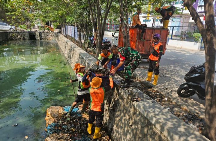 Sertu Marjuki dalam kegiatan karya bakti bersama PPSU di sungai membersihkan sampah,” Ia mengatakan Kegiatan ini juga bertujuan untuk mengajak masyarakat agar mencintai kebersihan mulai dari diri sendiri dan lingkungan sekitar. Kegiatan dilakukan bersama sama agar cepat selai ini di namakan gotong royong,” Katanya
