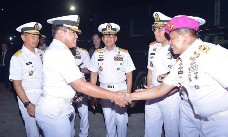 Jakarta || Kepala Staf Korps Marinir (KS Kormar) Brigadir Jendral Muhammad Nadir, M.Tr.Opsla yang mewakili Panglima Korps Marinir Letjen TNI (Mar) Dr. Endi Supardi, S.E., M.M., M.Tr.Opsla., CHRMP., CRMP. Menghadiri jamuan makan malam yang diselenggarakan di atas kapal perang Jepang, JS Osumi, yang sedang bersandar di Pelabuhan Tanjung Priok. Acara ini merupakan bagian dari upaya meningkatkan hubungan bilateral antara Tentara Nasional Indonesia dan Angkatan Laut Jepang. di Dermaga 107, Tanjung Priok, Jakarta Utara, Minggu (24/08/2025).