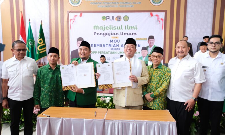 KOTA SUKABUMI || Koranprogresif.id – Menteri Agraria dan Tata Ruang/Kepala Badan Pertanahan Nasional (ATR/BPN), Nusron Wahid, menandatangani Nota Kesepahaman (MoU) yang meresmikan kerja sama dengan Dewan Pimpinan Pusat (DPP) Persatuan Ummat Islam (PUI), di Pondok Pesantren Syamsul ‘Ulum, Kota Sukabumi, Rabu (16/04/2025).