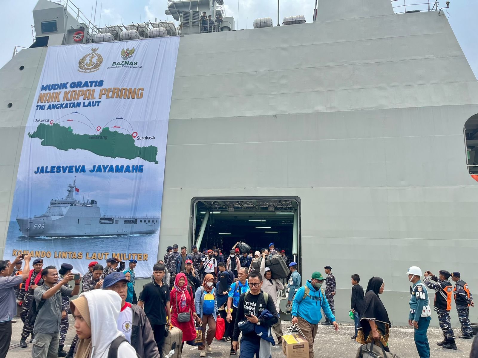 Jakarta – koranprogresif.co.id – Usai di lepas Kepala Staf Angkatan Laut (Kasal), Laksamana TNI Dr. Muhammad Ali pada tanggal 5 April 2024 lalu di Dermaga Kolinlamil Jakarta Utara, para peserta mudik gratis jalur laut menggunakan KRI Banda Aceh-593 (KRI BAC-593) tiba di Dermaga Tanjung Emas, Semarang, Sabtu kemarin (06/04) dan di Dermaga Madura Koarmada II/Surabaya, Minggu (07/04).