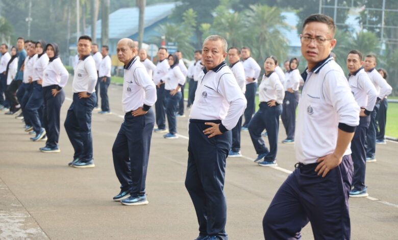 Komandan Sekolah Staf dan Komando Angkatan Laut (Danseskoal) Laksamana Muda TNI Ariantyo Condrowibowo bersama seluruh prajurit dan Pegawai Negeri Sipil (PNS) di lingkungan Seskoal melaksanakan olahraga di lapangan Laut Jawa Seskoal, Cipulir, Kebayoran Lama, Jakarta Selatan, Selasa (15/7/2025).