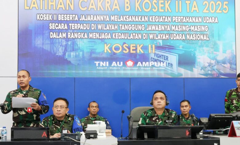 Makassar || Koranprogresif.id, Panglima Komando Operasi Udara II (Pangkoopsud II) Marsda TNI Deni Hasoloan Simanjuntak meninjau langsung pelaksanaan Latihan Pertahanan Udara Cakra B-25 Tahun 2025 yang digelar oleh Kosek II Makassar, Rabu (18/6/2025). Latihan yang berlangsung selama sepekan, 10–17 Juni 2025, di Ruang Yudha Posek Kosek II ini bertujuan untuk menguji kesiapsiagaan satuan operasional udara terhadap potensi pelanggaran wilayah udara nasional, sesuai arahan Pangkoopsudnas Marsdya TNI Ir. Tedi Rizalihadi S., M.M.
