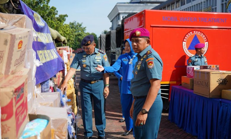 Komandan Kodaeral III, Laksda TNI Uki Prasetia, S.T., M.M. yang didampingi Ketua Daerah Kodaeral III Gabungan Jalasenastri Koarmada RI, Ny. Hening Uki Prasetia meninjau posko penerimaan bantuan kemanusiaan yang berada di Makodaeral III, Jakarta Utara, Senin (1/12).