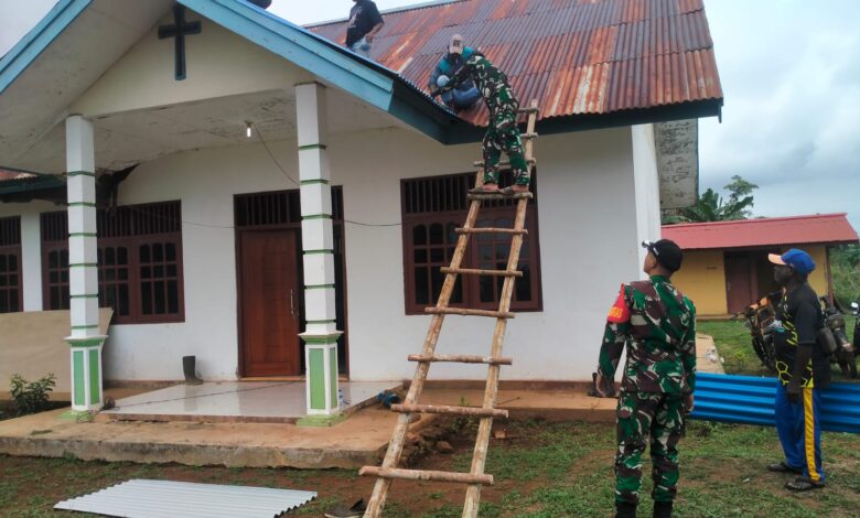Peduli Rumah Ibadah di Perbatasan RI-PNG, Satgas Pamtas Yonif 726/Tml Laksanakan Karya Bakti Pembongkaran Atap Gereja Katolik Santa Bernadetha Di Kampung Sipias