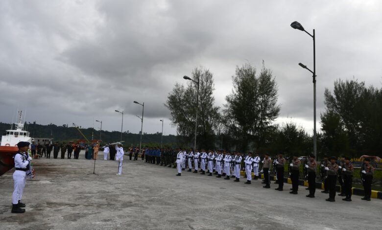 Simeulue || Koranprogresif.id, Peringati Hari Pahlawan Tahun 2024, Danlanal Simeulue Letkol Laut (P) Oyu Mulia Sukmana, S.T., M.T., M.Tr. Opsla., yang diwakili oleh Palaksa Lanal Simeulue Mayor Laut (T) Firdaus bertindak sebagai Inspektur Upacara pada prosesi Upacara Tabur Bunga di Pelabuhan Laut/Kargo Sinabang dalam rangka memperingati Hari Pahlawan di Kabupaten Simeulue, Minggu (10/11/2024).