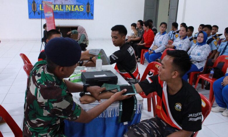 Donor Darah bekerjasama dengan PMI Kabupaten Nias Selatan bertempat di ruang Bima Mako Lanal Nias yang diikuti Perwira Staf beserta prajurit, Jalasenastri Cabang 5 Korcab II DJA I Lanal Nias dan Siswa-Siswi SMA Taruna Hangtuah Nias.
