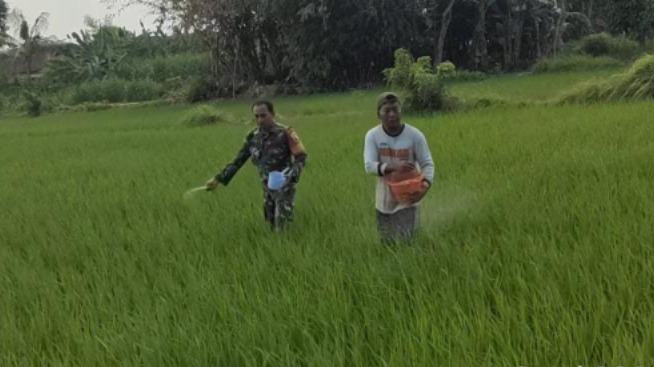 Pendampingan ini dilakukan di lahan sawah milik anggota Kelompok Tani Sri Sedono yang tengah memasuki masa pemupukan. Serda Saiful turut membantu proses penaburan pupuk agar tanaman padi tumbuh subur dan produksi hasil panen dapat maksimal.