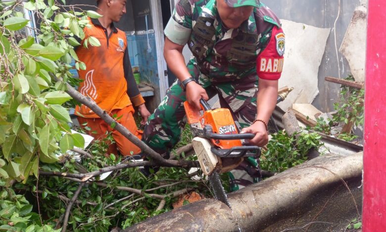 Tampak Babinsa Sertu Sumekto bersama warga masyarakat sekitarnya bergerak cepat menuju rumah yang rusak akibat tertimpa pohon, membantu membersihkan puing puing reruntuhan bangunan rumah dan menyingkirkan pohon yang tumbang tersebut dengan menggunakan mesin senso dan peralatan seadanya.