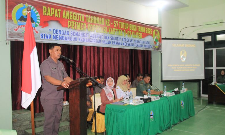 KLATEN – Bertempat di Aula Makodim 0723/Klaten, telah dilaksanakan Rapat Anggota Tahunan (RAT) ke-57 Primkop Kartika D-03 Klaten Tutup Buku Tahun 2025, dengan mengusung tema “Dengan Semangat Adaptif dan Solutif, Koperasi Angkatan Darat Siap Membangun Kemandirian Dalam Rangka Mensejahterakan Anggota.” Kegiatan berlangsung dengan aman dan lancar serta dihadiri oleh para undangan dan anggota koperasi. (11/2/2026)
