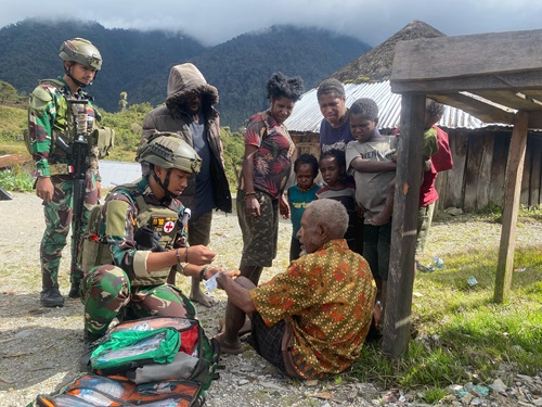 Puncak Jaya – Personel Pos Nume Satgas Yonif 112/DJ melaksanakan Pelayanan Kesehatan secara Door To Door di Kampung Karubaga Distrik Nume Kabupaten Puncak Jaya Provinsi Papua Tengah, Kamis (27/03/2025).