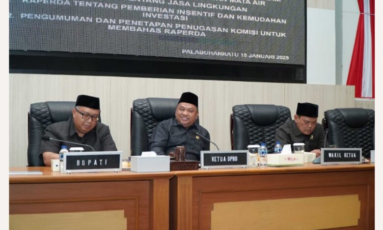 Raperda tentang Pengetahuan Tradisional dalam penetapan kawasan Perlindungan Mata Air dan Raperda tentang Jasa Lingkungan dibahas oleh Badan Pembentukan Peraturan Daerah (Bapemperda) Kabupaten Sukabumi, Raperda tentantang Pemberian Insentif dan Kemudahan Investasi, ditugaskan kepada Komisi I DPRD Kab. Sukabumi.