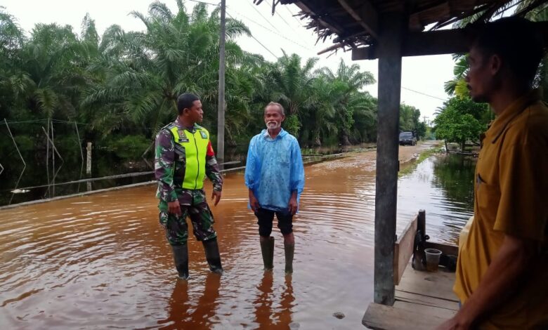 Redam Kepanikan Warga, Babinsa Koramil 08/Arongan Lambalek Pantau Dan Monitoring Perkembangan Banjir Di Desa Binaan