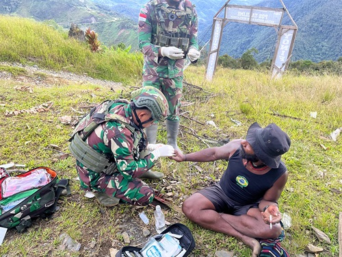 Puncak Jaya – Satgas Yonif 715/Mtl langsung merespon cepat dan memberikan pertolongan kepada Bapak Kopinggup Wonda dari kampung talilime pada pukul 10.00 WIT yang datang ke pos Talilime untuk berobat, diketahui Bapak Kopinggup Wonda memiliki luka pada jari tengah tangan kanan akibat terkena sabitan parang sehingga tangannya mengalami luka sobek yang cukup besar.