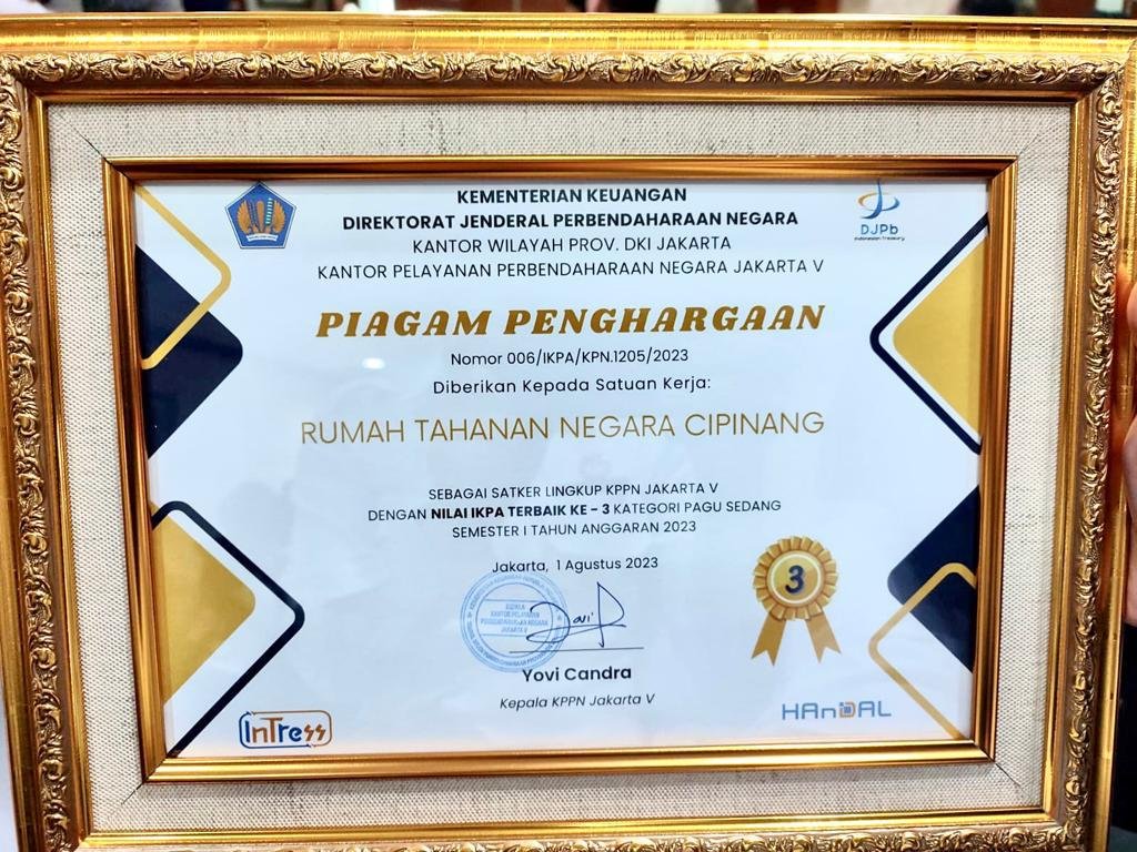 Piagam Penghargaan tersebut diterima langsung oleh Kepala Rutan Kelas I Cipinang yang diwakili oleh Kepala Sub Seksi Keuangan dan Perlengkapan, Nuraini. Adapun penganugerahan penghargaan tersebut tidak lepas dari bentuk apresiasi KPPN terhadap instansi pemerintahan yang memiliki catatan yang baik dalam pelaksanaan anggaran di tahun 2023.