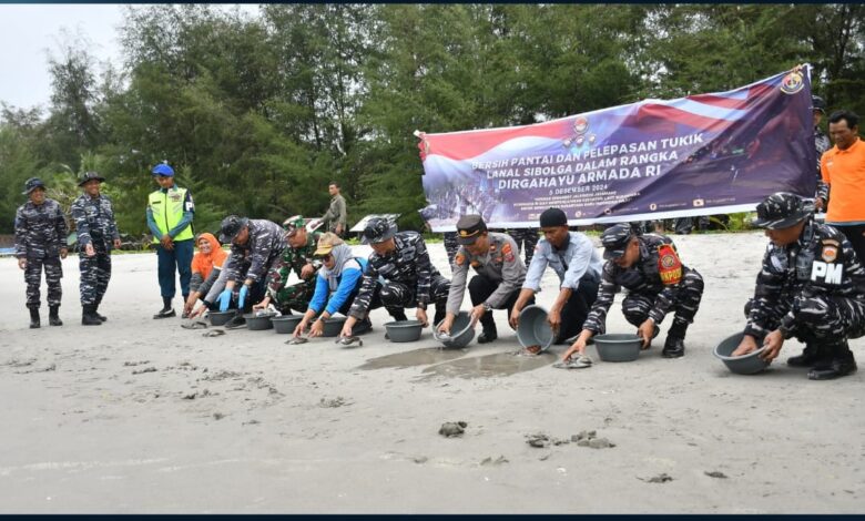 Sambut Hari Armada RI, Lanal Sibolga Laksanakan Bersih Pantai dan Pelepasan Tukik di Pantai Binasi Sorkam Barat