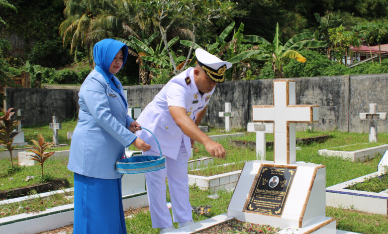 Ziarah dan Tabur Bunga dipimpin langsung oleh Danlanal Nias Kolonel Laut (P) Wishnu Ardiansyah, S.E., M.Tr.Hanla., M.M., CHRMP., didampingi Ketua Jalasenastri Cabang 5 Korcab II DJA 1 Ny. Indria Wishnu Ardiansyah, beserta Perwira Staf dan Anggota Jalasenastri.