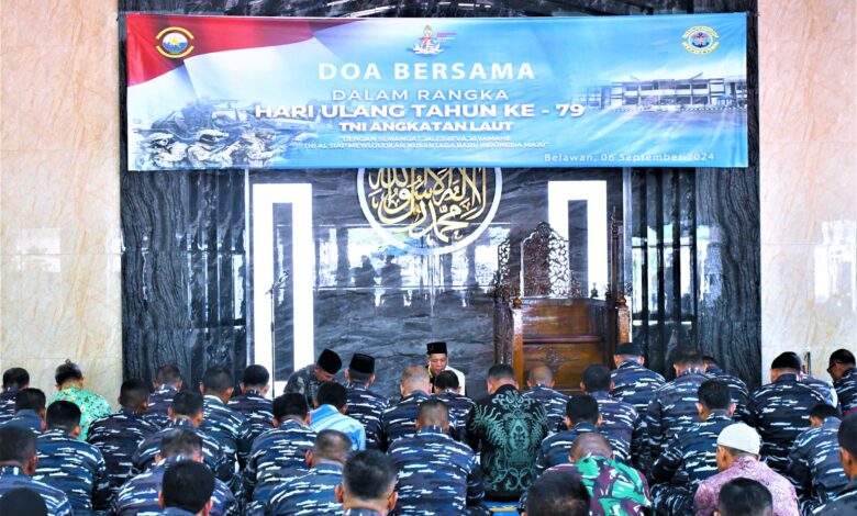 Belawan || Koranprogresif.id, Pangkalan Utama TNI Angkatan Laut I (Lantamal I) melaksanakan Doa Bersama dalam rangka menyambut Hari Ulang Tahun Ke-79 TNI Angkatan Laut Tahun 2024 dengan tema “Dengan Semangat Jalesveva Jayamahe TNI AL Siap Mewujudkan Nusantara Baru Indonesia Maju”, bertempat di Mako Lantamal I, Jalan Serma Hanafiah No.01, Belawan, Sumatera Utara, Jumat (06/9/2024).