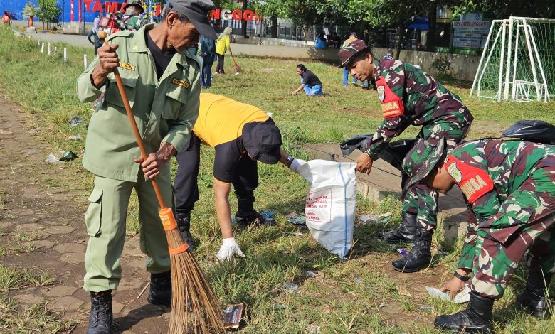 Terlihat personel TNI bersama unsur gabungan dan masyarakat bekerja sama membersihkan lingkungan dengan penuh semangat kebersamaan.