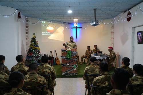 Lebanon Selatan – Umat Kristiani yang tergabung dalam Satgas Indobatt XXIII-R/UNIFIL di Lebanon merayakan Natal bersama di Markas Indobatt UNP 7-1, Adchit al Qusayr, Lebanon Selatan, Rabu (25/12/2024).
