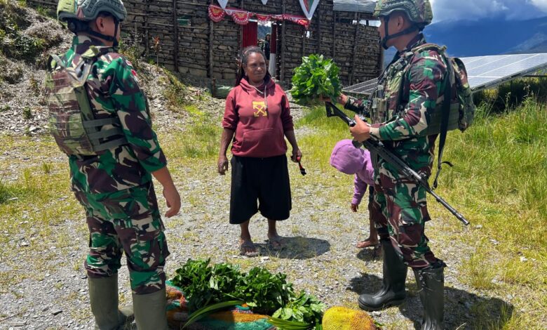 Puncak Jaya – Satgas Yonif 715/Mtl Pos Pintu Angin memborong habis hasil tani dari Mama Papua yang datang ke Pos stelah memanen kebunnya yang berada di Puncak Jaya Papua, Senin (3/02/2025).