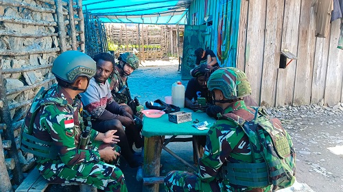Puncak Jaya – Personel Satgas Pamtas Kewilayahan Yonif 715/Motuliato Pos Tonolok dalam rangka menjalin hubungan baik dengan masyarakat di daerah penugasan, personel pos Tinolok melaksanakan kegiatan komunikasi sosial (Komsos) secara humanis dengan menyapa masyarakat di Kabupaten Mulia khususnya di Kampung Tinolok Puncak Jaya Papua, Rabu (15/01/2025).