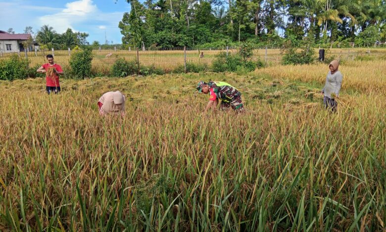 Selalu Ada Bersama Warga Binaan Babinsa Jajaran Korem 012/TU Bantu Petani Panen Padi