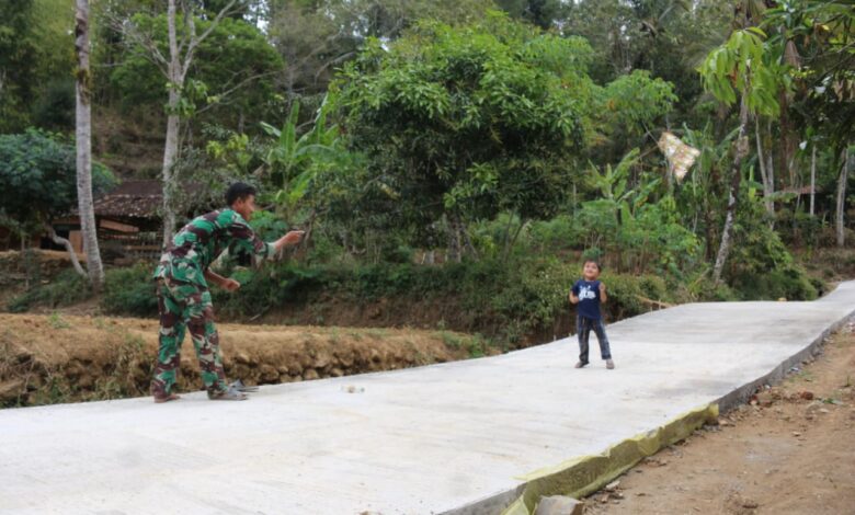 Ditemani Pratu Mar Guntur Bagus Permadi, salah satu anggota Satgas TMMD ke-121 Desa Selur, Zulfi menaikkan layang-layang kesayangannya sambil tertawa lepas dan tidak takut jatuh seperti dulu lagi karena jalan sudah rata, halus dan bagus.