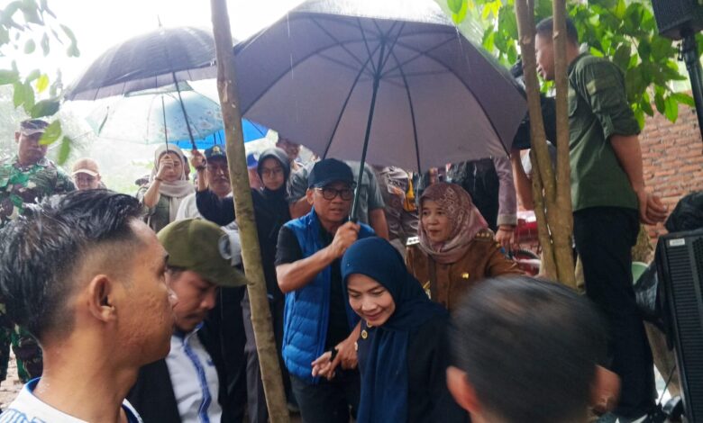 Menteri Desa dan Daerah Tertinggal, Yandri Susanto terlihat berjalan beriringan berlindung di bawah payung dari guyuran hujan bersama Bupati Serang terpilih Ratu Rachmatu Zakia saat menyapa warga di Masjid Hairutaqwa Kampung Saung Ilir Desa Talaga, Kecamatan Mancak, Kabupaten Serang, Provinsi Banten, untuk menyapa warga dalam rangkaian kegiatan HKSN 2024 tersebut.