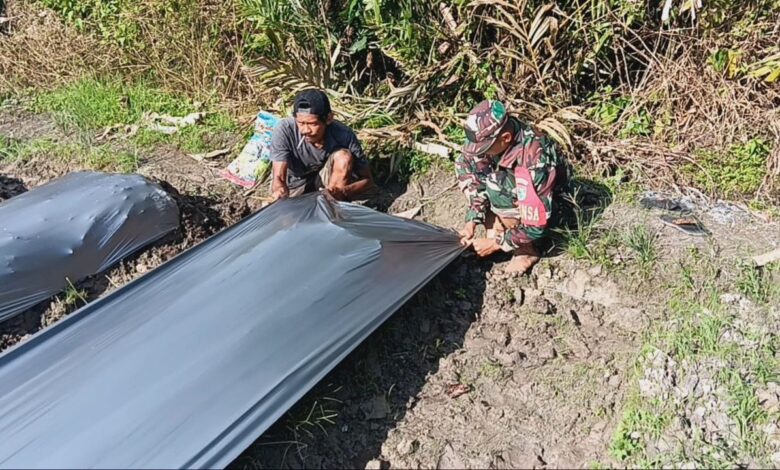 Siapkan Lahan, Babinsa Mapurujaya Dampingi Petani Memasang Plastik Mulsa