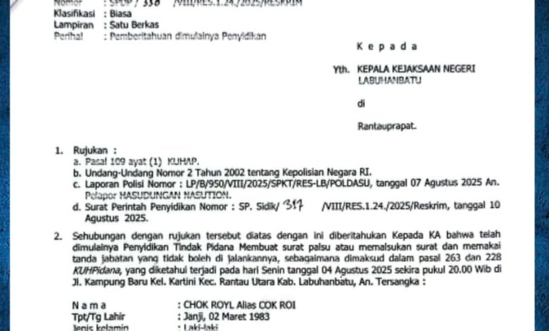 Belawan,- Denintel Kodaeral I berkolaborasi dengan Polres Labuhan Batu berhasil membongkar kasus penipuan dan pemalsuan dokumen yang dilakukan Chok Roy Lubis (42 tahun), warga Labuhan Batu. Pelaku diketahui mengaru sebagai Pejabat TNI Angkatan Laut dengan mengenakan seragam dan menggunakan surat berkop TNI AL untuk meminta dukungan dana dari berbagai perusahaan.