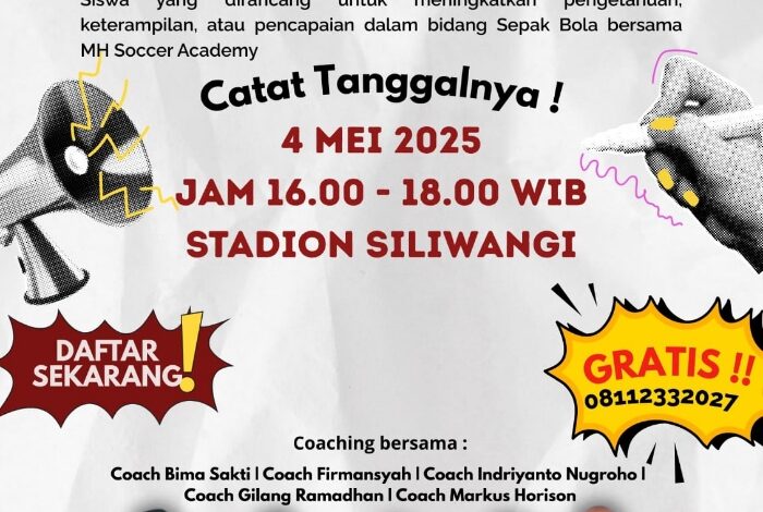 BANDUNG, koranprogresif.id – MH Soccer Academy akan menggelar kegiatan Coaching Clinic Session yang dirancang khusus sebagai sesi pelatihan dan pembinaan singkat bagi anak-anak dan orang tua yang berminat mendalami dunia sepak bola sejak usia dini. Acara ini akan berlangsung pada Minggu, 4 Mei 2025, pukul 16.00–18.00 WIB, bertempat di Stadion Siliwangi, Kota Bandung.