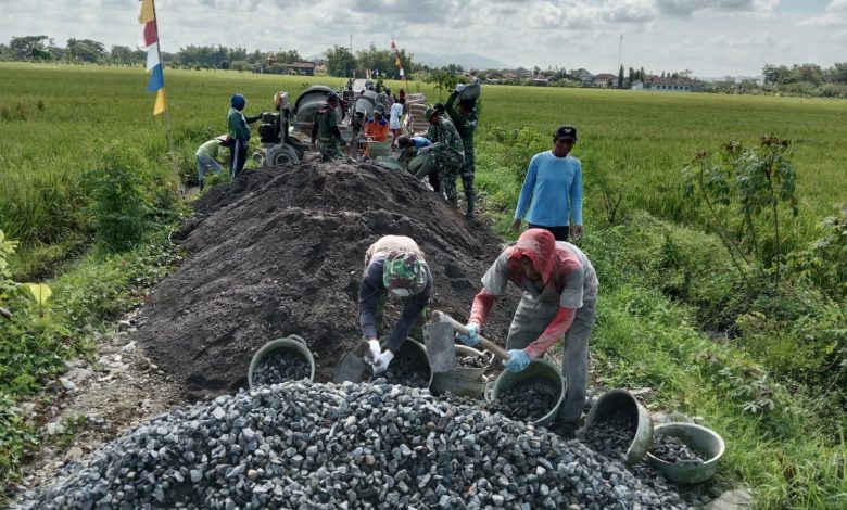 Meski di bawah terik matahari, semangat gotong royong antara anggota TNI dan masyarakat tampak begitu tinggi. Personel Koramil 20/Cawas Kodim 0723/Klaten bersama warga Desa Mlese bahu membahu mengerjakan pembangunan infrastruktur jalan pertanian. Antusiasme tersebut menjadi cerminan nyata kemanunggalan TNI dengan rakyat dalam upaya membangun desa.