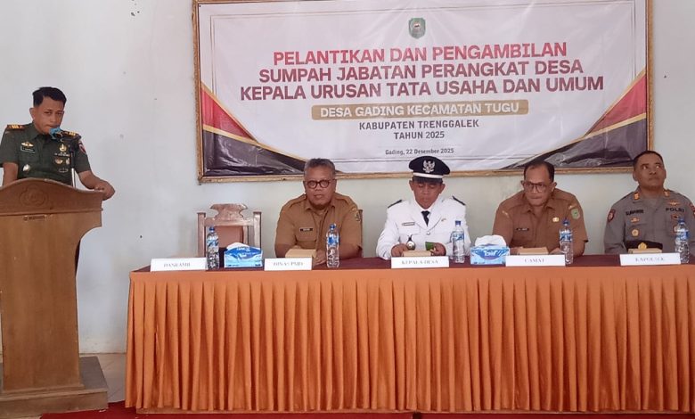 TRENGGALEK || Koranprogresif.id – Sinergitas TNI dan Polri melalui satuan teritorial terus menunjukkan peran strategisnya dalam mendukung program Pemerintah hingga ke tingkat Desa. Komitmen tersebut diwujudkan melalui kehadiran unsur TNI–Polri dan Pemerintah Kecamatan dalam kegiatan pelantikan dan pengambilan sumpah janji perangkat Desa Gading, Kecamatan Tugu, Kabupaten Trenggalek, Senin (22/12/2025).