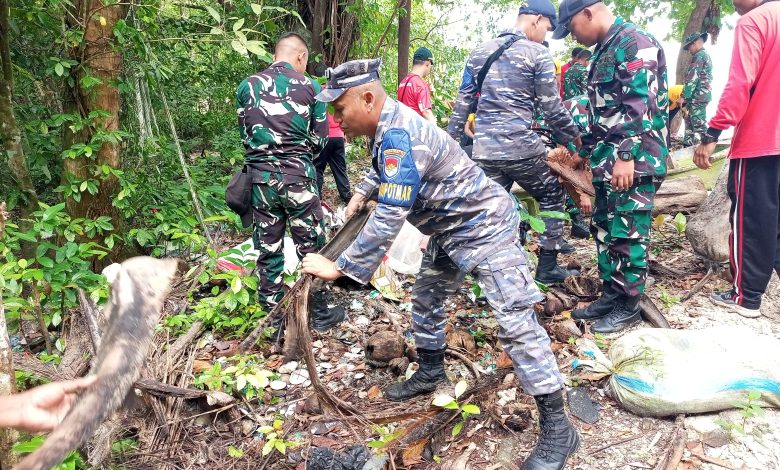 Bengkulu,- Pos TNI Angkatan Laut (Posal) Enggano jajaran Lanal Bengkulu bersama Forum Koordinasi Pimpinan Kecamatan (Forkopincam) Enggano melaksanakan kegiatan karya bakti bersih-bersih pantai sebagai bentuk kepedulian terhadap kebersihan dan kelestarian lingkungan pesisir di wilayah Enggano,