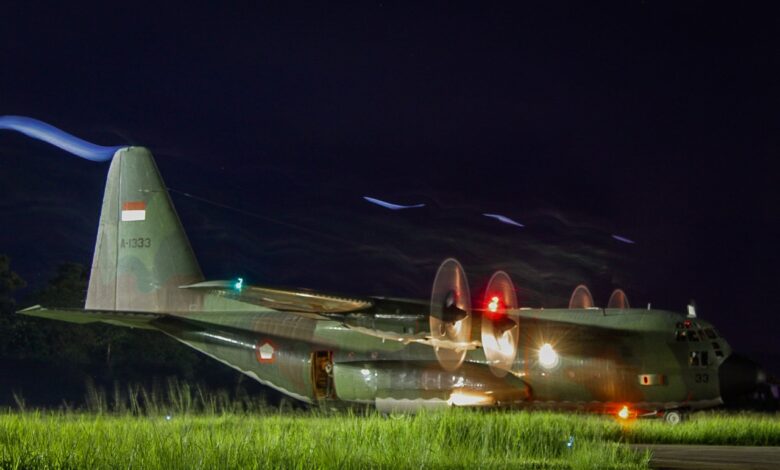 Makassar – Dua pesawat Hercules C-130H dari Skadron Udara 33 Lanud Sultan Hasanuddin membelah gelapnya malam langit Makassar, pada Selasa malam (11/2/2025). Di kokpit, redup cahaya hijau Night Vision Goggles (NVG), menyusup setiap detail medan yang dilaluinya.
