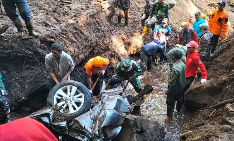 Jatim – Anggota Kodim 0815 Mojokerto bersama relawan melakukan evakuasi korban tanah longsor yang terjadi di Desa Pacet, Kabupaten Mojokerto, Jawa Timur, Kamis (3/4/2025). Bencana alam tersebut mengakibatkan terputusnya jalur Pacet-Cangar, sehingga menghambat akses transportasi dan aktivitas warga.