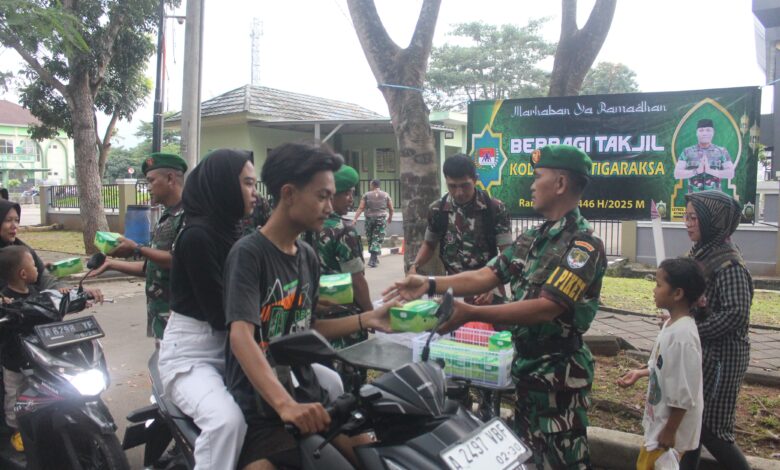 Tigaraksa || Koranprogresif.id, Kodim 0510/Tigaraksa menggelar aksi berbagi takjil kepada masyarakat yang melintas di depan Markas Kodim (Makodim) Tigaraksa, Minggu sore, (02/03/2025). Kegiatan ini menjadi bagian dari tradisi tahunan selama bulan suci Ramadhan, di mana personel TNI membagikan makanan berbuka kepada pengguna jalan dan warga sekitar.