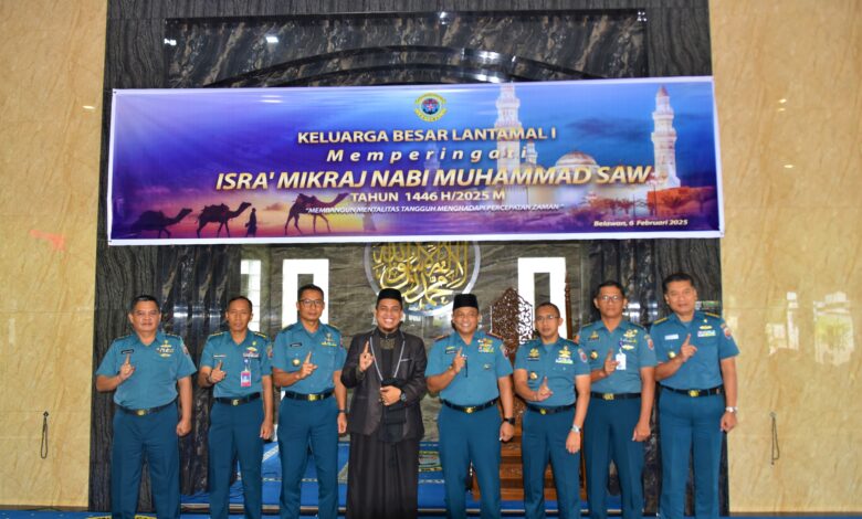 Belawan || Koranprogresif.id, Komandan Pangkalan Utama TNI Angkatan Laut (Danlantamal I) Brigjen TNI (Mar) Jasiman Purba, S.E., CHRMP., diwakili Wadan Lantamal I Kolonel Laut (P) Baharuddin Anwar, S.T., M.M., menghadiri Peringatan Isra Mi’raj Nabi Muhammad SAW 1456 H/2025 M, bertempat di Masjid Al Abrar Mako Lantamal I, Jalan Serma Hanafiah No. 01 Belawan, Sumatera Utara, Kamis (6/2/2025).