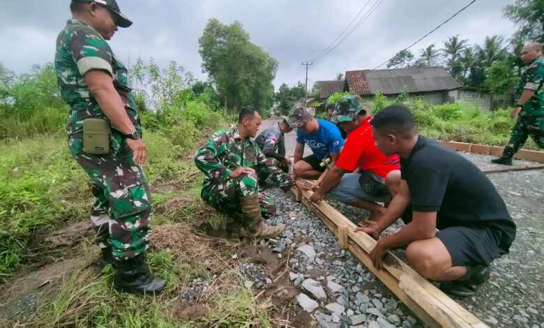Dalam pengerjaan pengerasan jalan desa, pemasangan bagesting menjadi salah satu tahap krusial. Proses ini membutuhkan ketelitian tinggi agar material yang digunakan benar-benar sesuai dengan standar konstruksi. Satgas TMMD tak hanya bertindak sebagai pekerja lapangan, tetapi juga memastikan bahan material tersedia dan digunakan secara optimal.